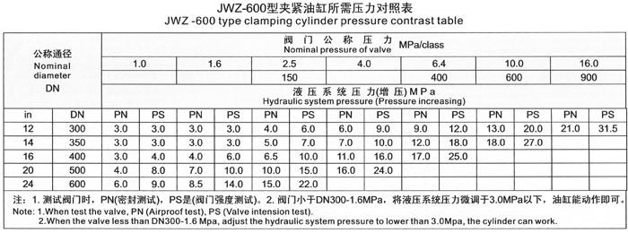 The test range of valve nominal diameter and nominal pressure for JWZ-600 model